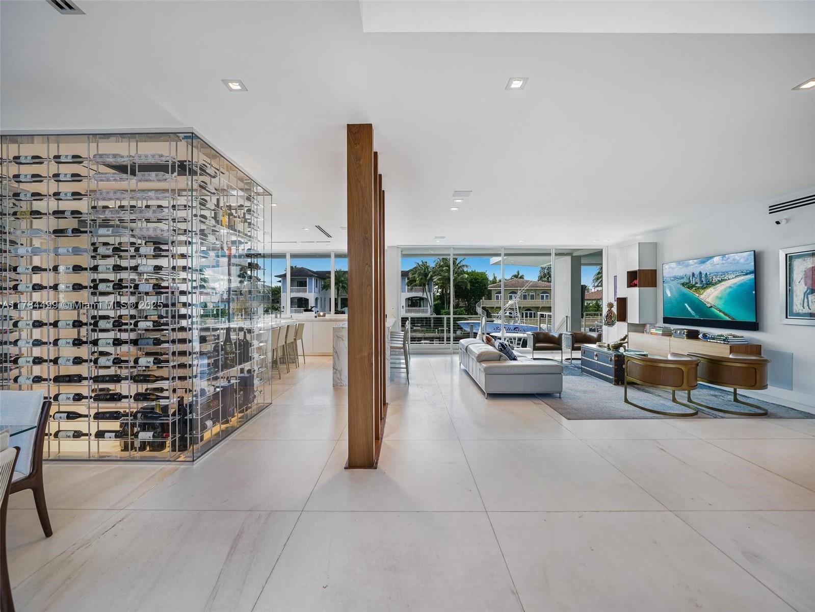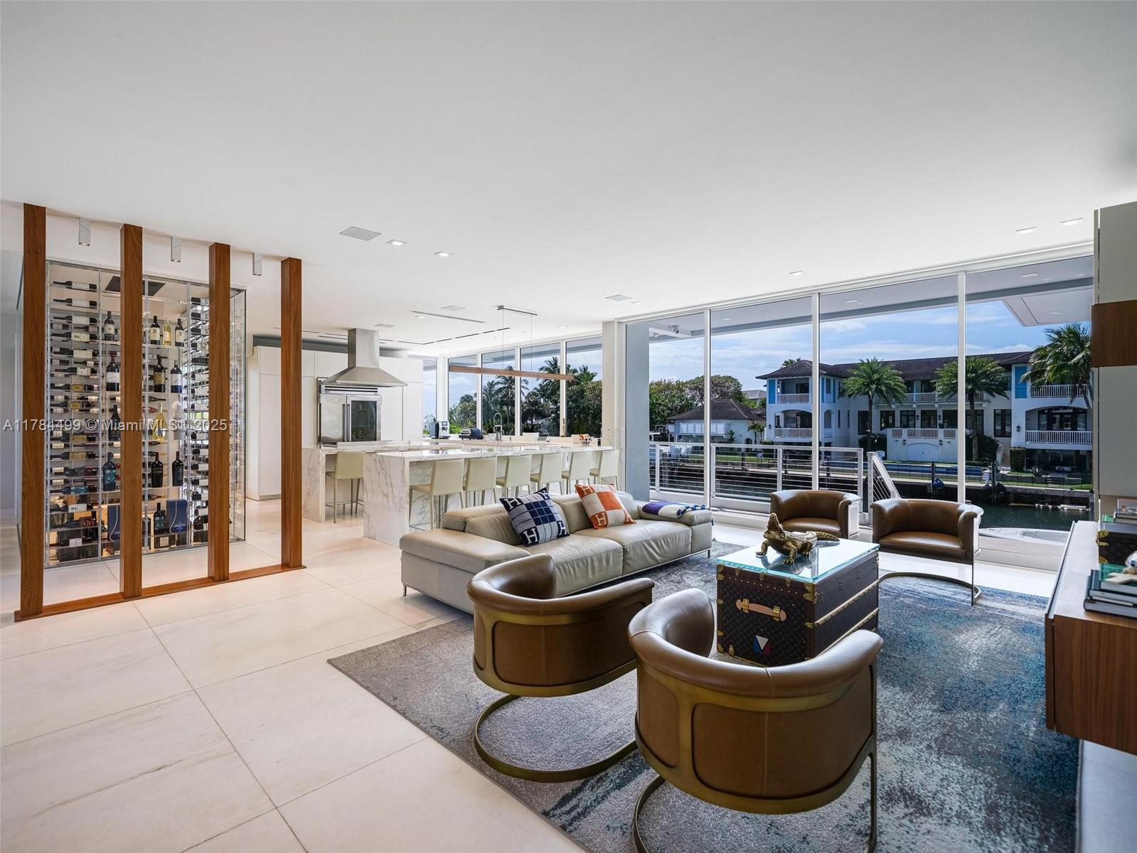 Waterfront luxury reimagined with 100’ of frontage & a 15,000 lb boat lift for up to a 40’ vessel. This 3-story, 9,911 SF smart home blends sleek Italian design with cutting-edge tech. The first floor features a private staff suite, gym, steam spa, staff kitchen, bar, full bath, and a 2,500-bottle wine cellar. The second level stuns with 48x48 marble floors, chef’s kitchen with Miele, Subzero, Italian glass cabinetry, 2 dishwashers, 325-bottle wine cellar, plus office, laundry, and ensuite bedrooms. Upstairs, the primary suite is joined by two additional ensuite bedrooms and a second living room. Fully automated smart home with Control4, 19 security cameras, Trane A/C, ESW impact windows, electric blinds, custom closets, dual kitchens, dual laundries, and A/C 2-car garage. Open Bay Views!